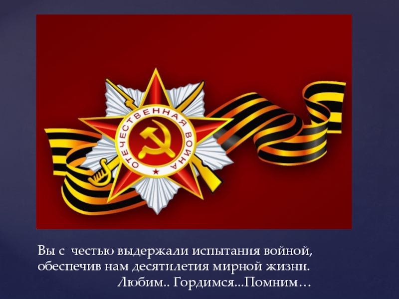 Слайд 16Вы с честью выдержали испытания войной, обеспечив нам десятилетия мирной жизни.