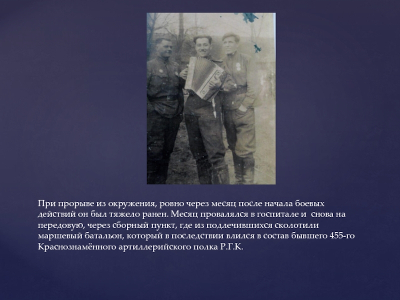 он был тяжело ранен. Месяц провалялся в госпитале и снова на передовую, через сборный пункт, где из подлечившихся сколотили маршевый батальон, который в последствии влился в состав бывшего 455-го Краснознамённого артиллерийского полка Р.Г.К.
