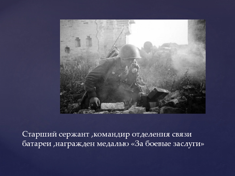 Слайд 4Старший сержант ,командир отделения связи батареи ,награжден медалью «За боевые заслуги»