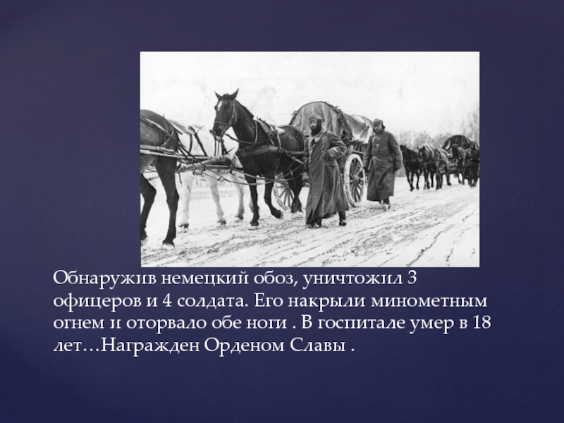 Слайд 15Обнаружив немецкий обоз, уничтожил 3 офицеров и 4 солдата. Его накрыли