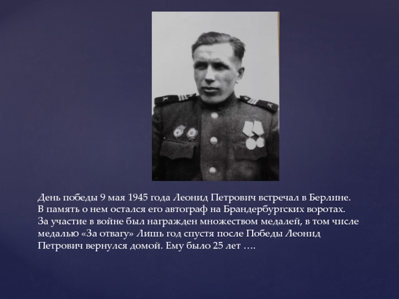 В память о нем остался его автограф на Брандербургских воротах. За участие в войне был награжден множеством медалей, в том числе медалью «За отвагу» Лишь год спустя после Победы Леонид Петрович вернулся домой. Ему было 25 лет ….