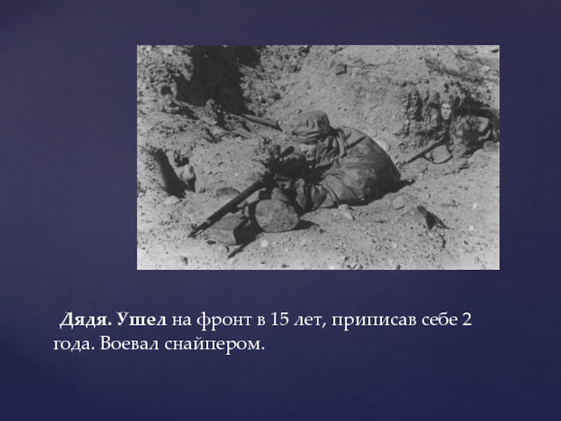 Слайд 14 Дядя. Ушел на фронт в 15 лет, приписав себе 2