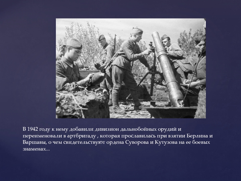 В 1942 году к нему добавили дивизион дальнобойных орудий и переименовали в артбригаду , которая прославилась при