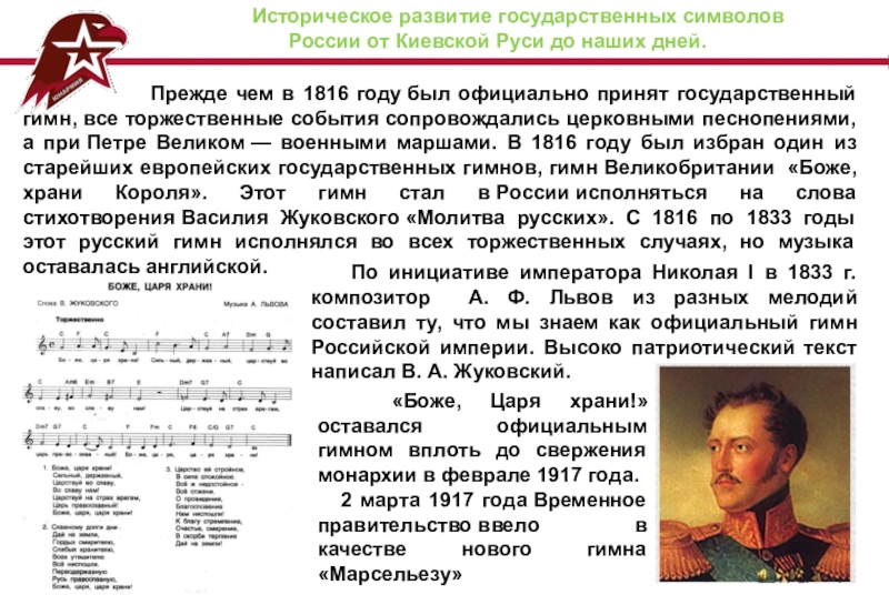 Прежде чем в 1816 году был официально принят государственный гимн, все торжественные события сопровождались церковными песнопениями, а при Петре Великом — военными маршами. В 1816 году был избран один из старейших европейских государственных гимнов, гимн Великобритании «Боже, храни Короля». Этот гимн стал в России исполняться на слова стихотворения Василия Жуковского «Молитва русских». С 1816 по 1833 годы этот русский гимн исполнялся во всех торжественных случаях, но музыка оставалась английской.