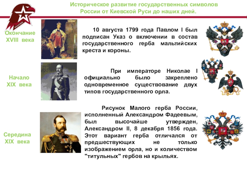 Рисунок Малого герба России, исполненный Александром Фадеевым, был высочайше утвержден, Александром II, 8 декабря 1856 года. Этот вариант герба отличался от предшествующих не только изображением орла, но и количеством "титульных" гербов на крыльях.