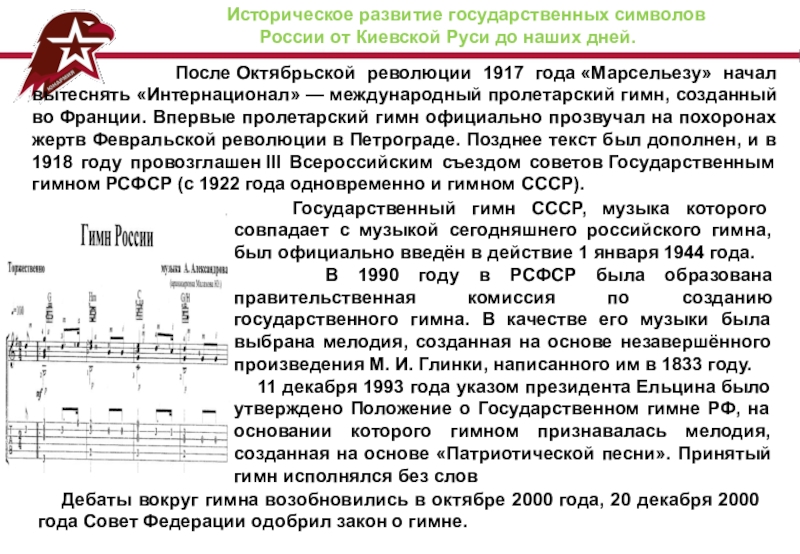 Дебаты вокруг гимна возобновились в октябре 2000 года, 20 декабря 2000 года Совет Федерации одобрил закон о гимне.