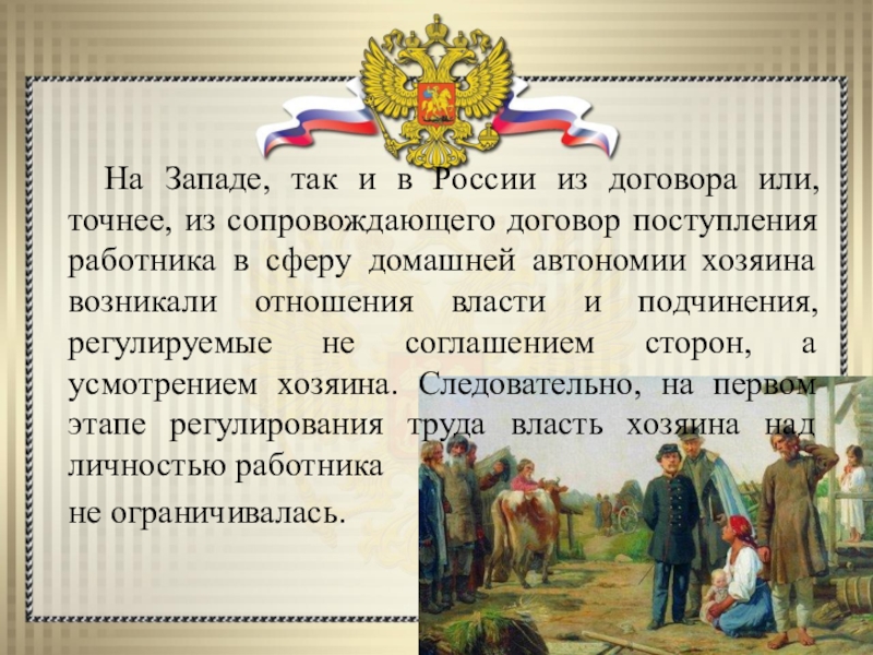 сопровождающего договор поступления работника в сферу домашней автономии хозяина возникали отношения власти и подчинения, регулируемые не соглашением сторон, а усмотрением хозяина. Следовательно, на первом этапе регулирования труда власть хозяина над личностью работника