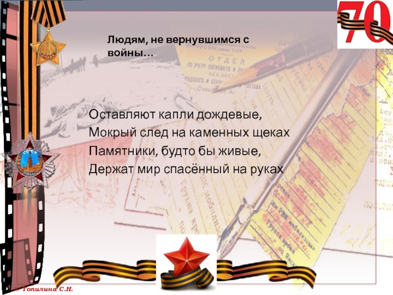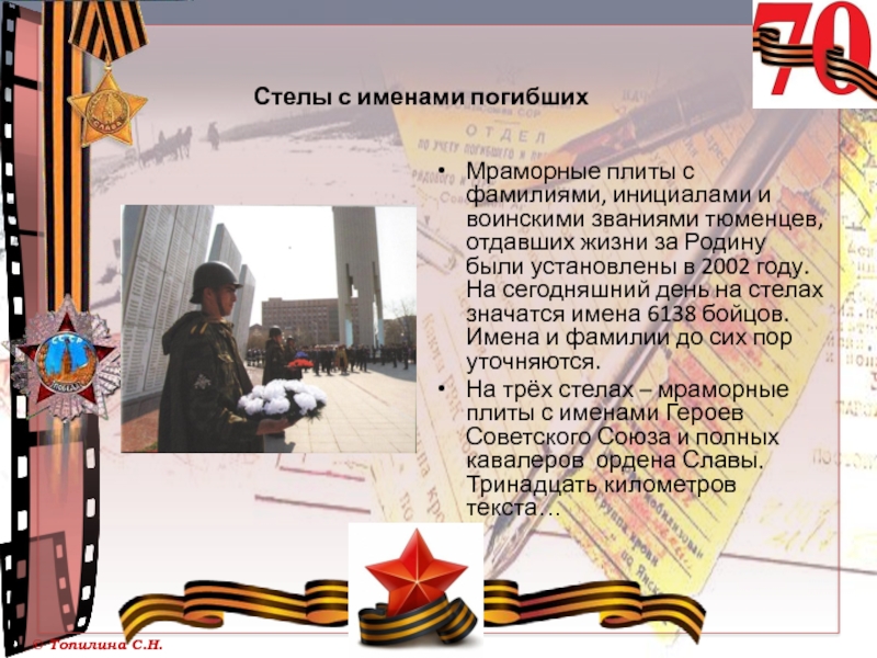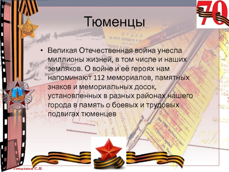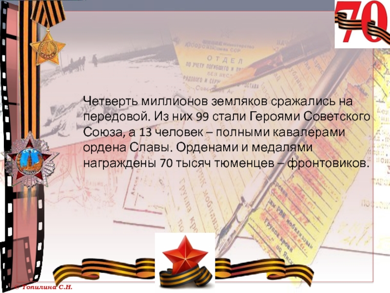 Советского Союза, а 13 человек – полными кавалерами ордена Славы. Орденами и медалями награждены 70 тысяч тюменцев – фронтовиков.