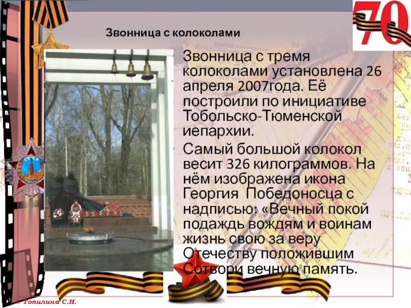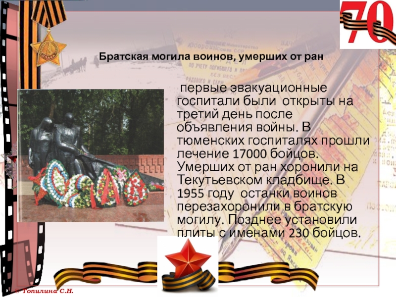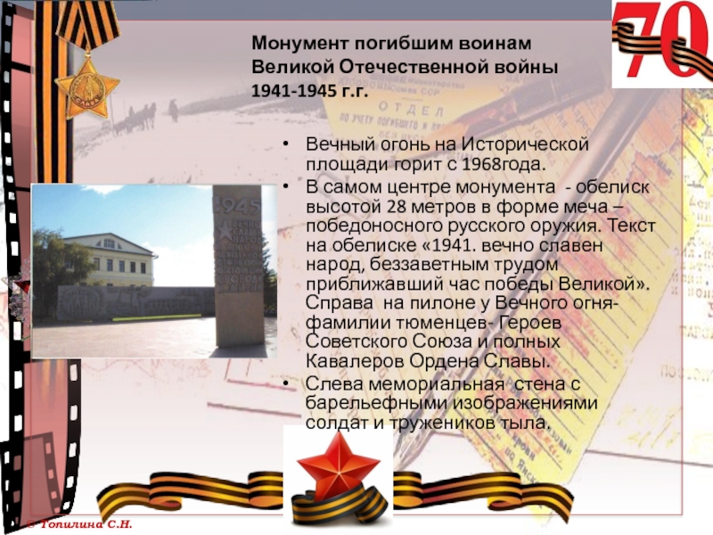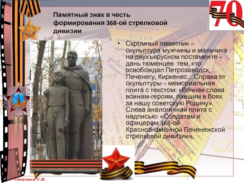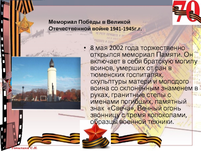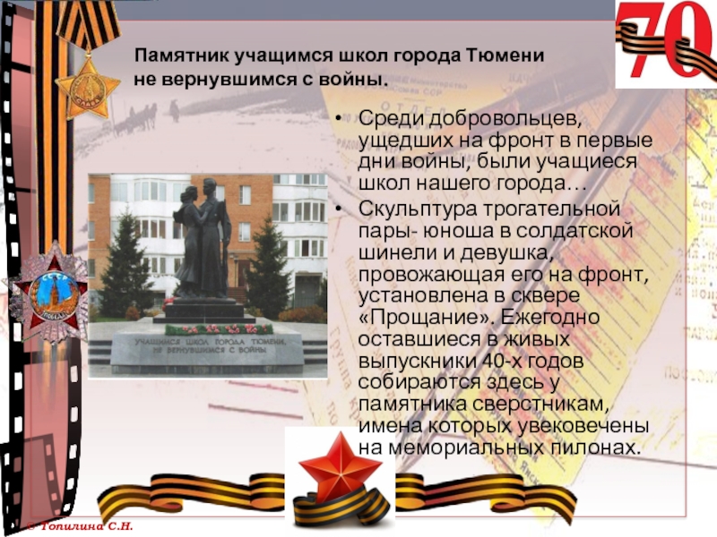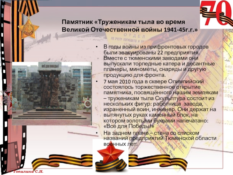 наших земляков. О войне и её героях нам напоминают 112 мемориалов, памятных знаков и мемориальных досок, установленных в разных районах нашего города в память о боевых и трудовых подвигах тюменцев