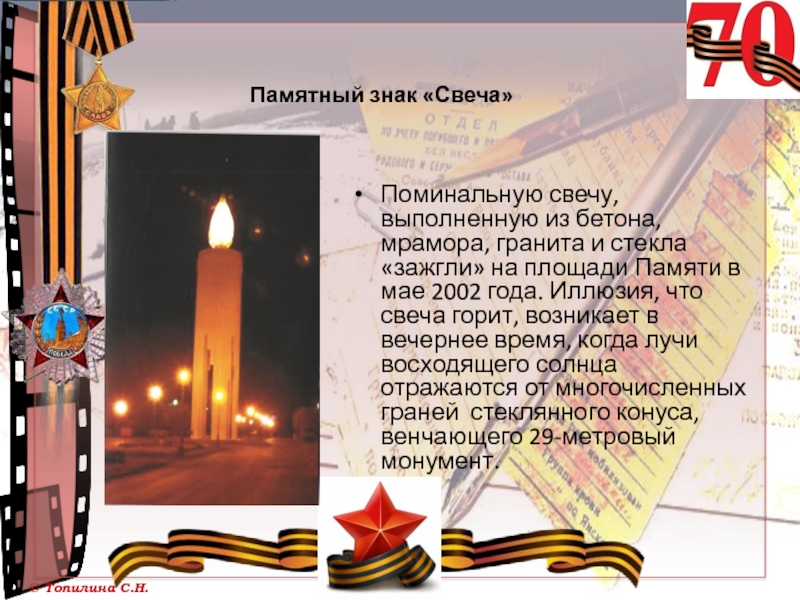 «зажгли» на площади Памяти в мае 2002 года. Иллюзия, что свеча горит, возникает в вечернее время, когда лучи восходящего солнца отражаются от многочисленных граней стеклянного конуса, венчающего 29-метровый монумент.