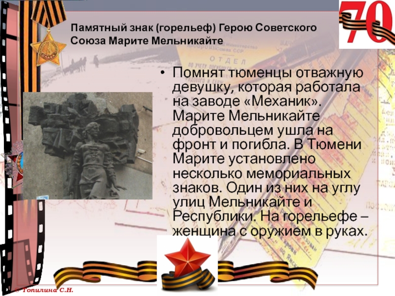Слайд 17Памятный знак (горельеф) Герою Советского Союза Марите Мельникайте