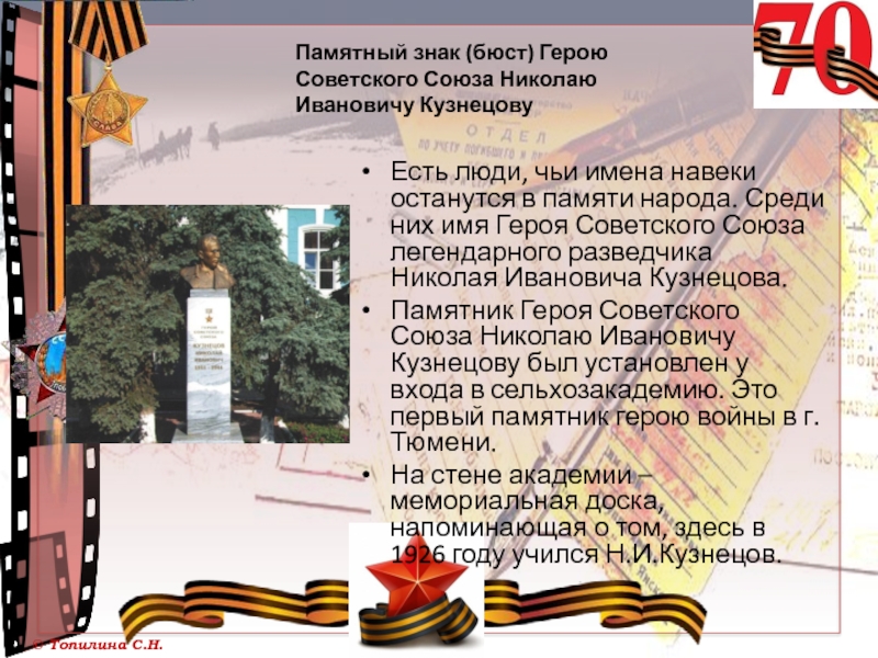 имена навеки останутся в памяти народа. Среди них имя Героя Советского Союза легендарного разведчика Николая Ивановича Кузнецова.