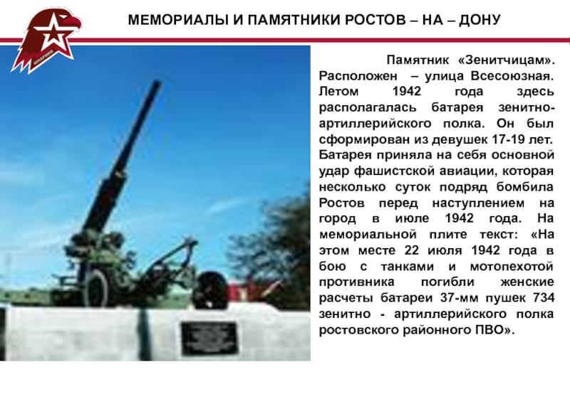 Памятник «Зенитчицам». Расположен – улица Всесоюзная. Летом 1942 года здесь располагалась батарея зенитно-артиллерийского полка. Он был сформирован из девушек 17-19 лет. Батарея приняла на себя основной удар фашистской авиации, которая несколько суток подряд бомбила Ростов перед наступлением на город в июле 1942 года. На мемориальной плите текст: «На этом месте 22 июля 1942 года в бою с танками и мотопехотой противника погибли женские расчеты батареи 37-мм пушек 734 зенитно - артиллерийского полка ростовского районного ПВО».