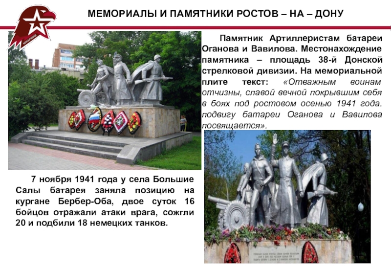 батареи Оганова и Вавилова. Местонахождение памятника – площадь 38-й Донской стрелковой дивизии. На мемориальной плите текст: «Отважным воинам отчизны, славой вечной покрывшим себя в боях под ростовом осенью 1941 года. подвигу батареи Оганова и Вавилова посвящается».