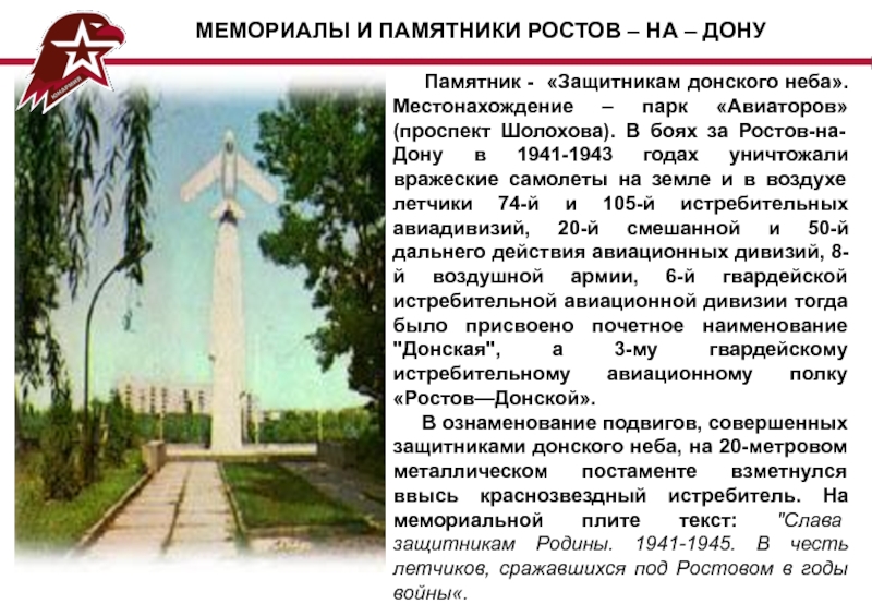 - «Защитникам донского неба». Местонахождение – парк «Авиаторов» (проспект Шолохова). В боях за Ростов-на-Дону в 1941-1943 годах уничтожали вражеские самолеты на земле и в воздухе летчики 74-й и 105-й истребительных авиадивизий, 20-й смешанной и 50-й дальнего действия авиационных дивизий, 8-й воздушной армии, 6-й гвардейской истребительной авиационной дивизии тогда было присвоено почетное наименование "Донская", а 3-му гвардейскому истребительному авиационному полку «Ростов—Донской».