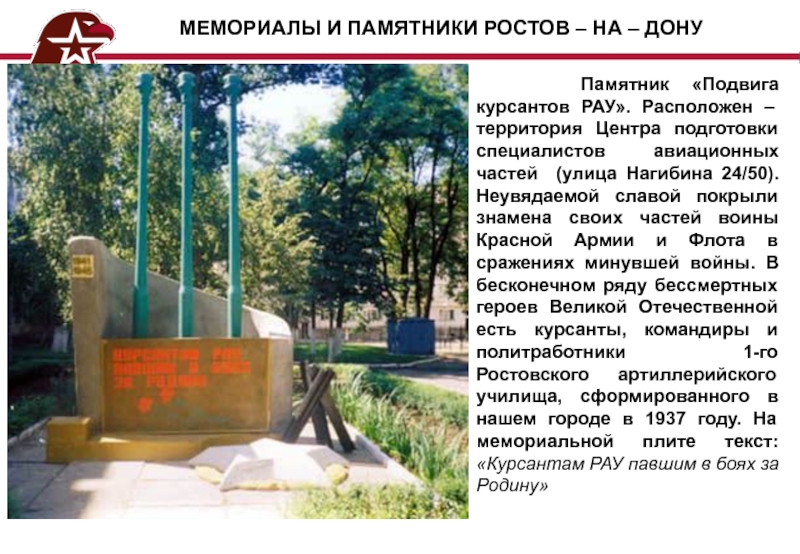 «Подвига курсантов РАУ». Расположен – территория Центра подготовки специалистов авиационных частей (улица Нагибина 24/50). Неувядаемой славой покрыли знамена своих частей воины Красной Армии и Флота в сражениях минувшей войны. В бесконечном ряду бессмертных героев Великой Отечественной есть курсанты, командиры и политработники 1-го Ростовского артиллерийского училища, сформированного в нашем городе в 1937 году. На мемориальной плите текст: «Курсантам РАУ павшим в боях за Родину»