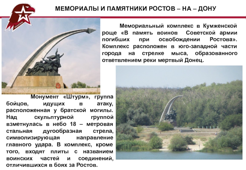 Монумент «Штурм», группа бойцов, идущих в атаку, расположенная у братской могилы. Над скульптурной группой взметнулась в небо 18 – метровая стальная дугообразная стрела, символизирующая направление главного удара. В комплекс, кроме того, входят плиты с названием воинских частей и соединений, отличившихся в боях за Ростов.