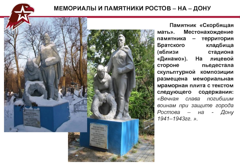 мать». Местонахождение памятника – территория Братского кладбища (вблизи стадиона «Динамо»). На лицевой стороне пьедестала скульптурной композиции размещена мемориальная мраморная плита с текстом следующего содержания: «Вечная слава погибшим воинам при защите города Ростова – на - Дону 1941–1943гг. ».