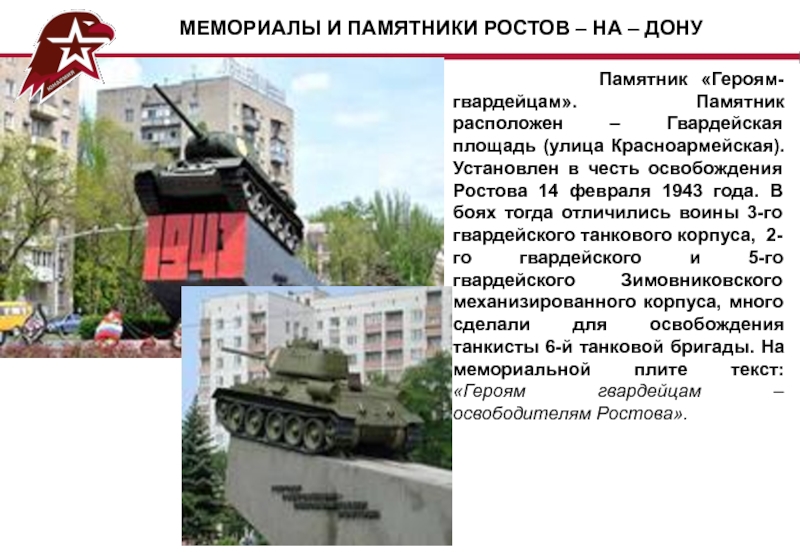 Памятник «Героям-гвардейцам». Памятник расположен – Гвардейская площадь (улица Красноармейская). Установлен в честь освобождения Ростова 14 февраля 1943 года. В боях тогда отличились воины 3-го гвардейского танкового корпуса, 2-го гвардейского и 5-го гвардейского Зимовниковского механизированного корпуса, много сделали для освобождения танкисты 6-й танковой бригады. На мемориальной плите текст: «Героям гвардейцам – освободителям Ростова».