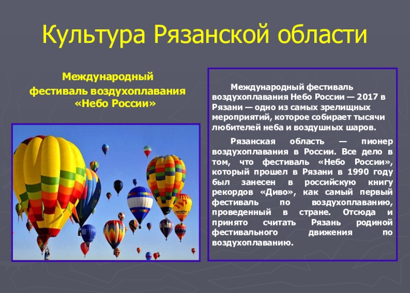 Рязанская область — пионер воздухоплавания в России. Все дело в том, что фестиваль «Небо России», который прошел в Рязани в 1990 году был занесен в российскую книгу рекордов «Диво», как самый первый фестиваль по воздухоплаванию, проведенный в стране. Отсюда и принято считать Рязань родиной фестивального движения по воздухоплаванию.