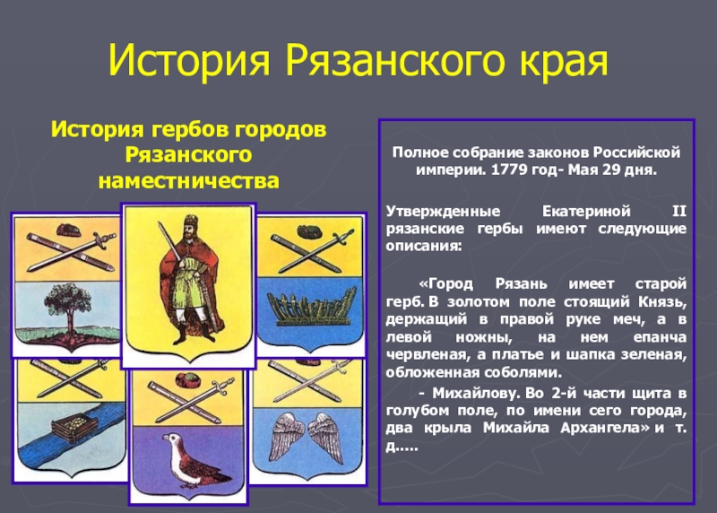 Утвержденные Екатериной II рязанские гербы имеют следующие описания: