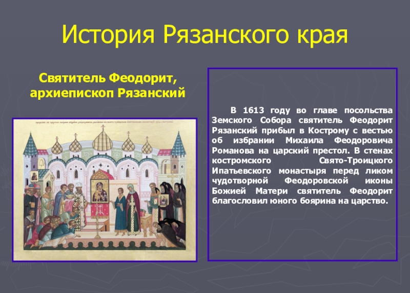 Земского Собора святитель Феодорит Рязанский прибыл в Кострому с вестью об избрании Михаила Феодоровича Романова на царский престол. В стенах костромского Свято-Троицкого Ипатьевского монастыря перед ликом чудотворной Феодоровской иконы Божией Матери святитель Феодорит благословил юного боярина на царство.