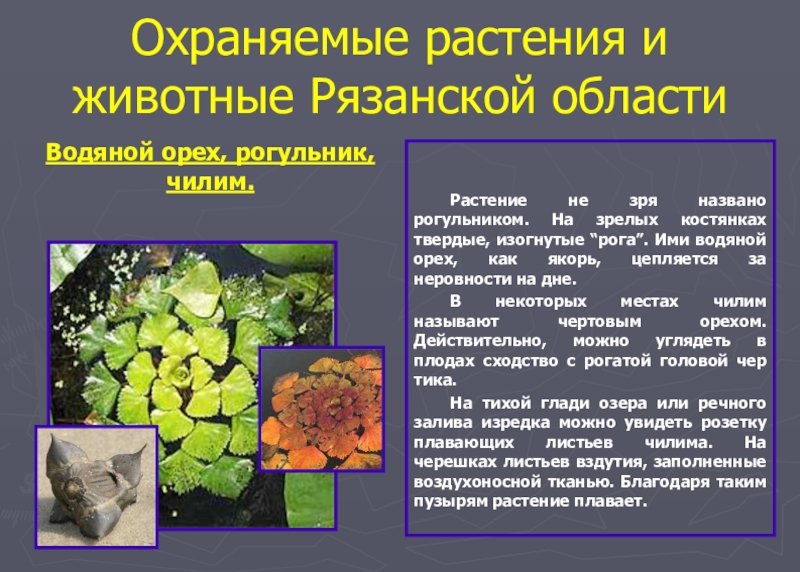 рогульником. На зрелых костянках твердые, изогнутые “рога”. Ими водяной орех, как якорь, цепляется за неровности на дне.