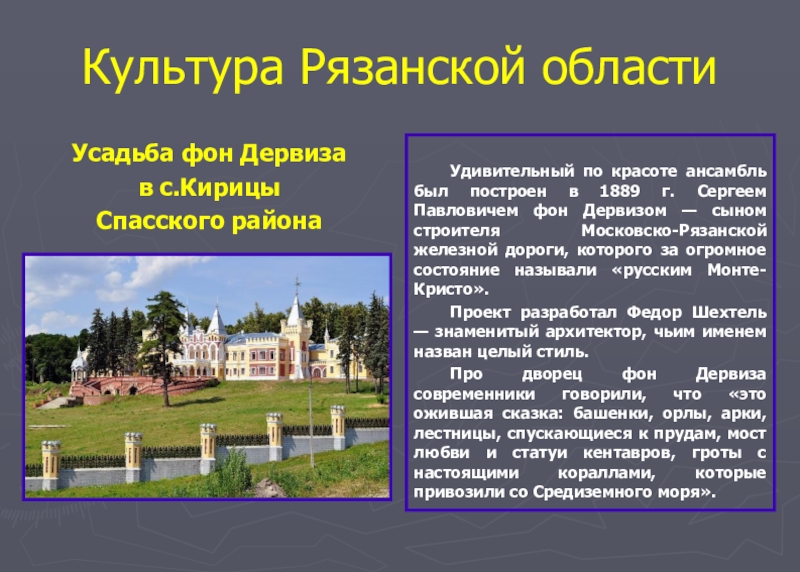 Про дворец фон Дервиза современники говорили, что «это ожившая сказка: башенки, орлы, арки, лестницы, спускающиеся к прудам, мост любви и статуи кентавров, гроты с настоящими кораллами, которые привозили со Средиземного моря».