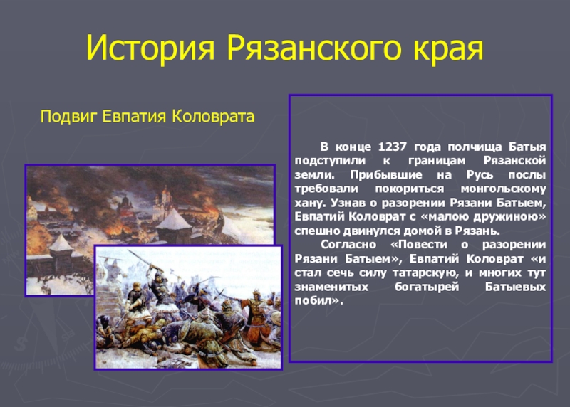к границам Рязанской земли. Прибывшие на Русь послы требовали покориться монгольскому хану. Узнав о разорении Рязани Батыем, Евпатий Коловрат с «малою дружиною» спешно двинулся домой в Рязань.