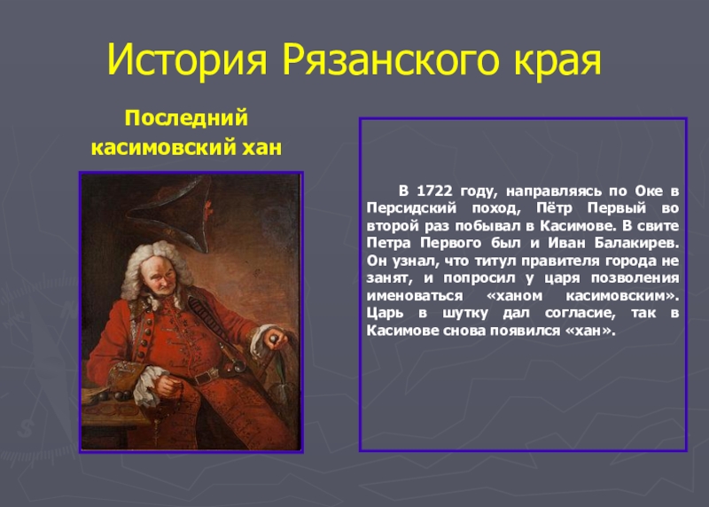 Персидский поход, Пётр Первый во второй раз побывал в Касимове. В свите Петра Первого был и Иван Балакирев. Он узнал, что титул правителя города не занят, и попросил у царя позволения именоваться «ханом касимовским». Царь в шутку дал согласие, так в Касимове снова появился «хан».
