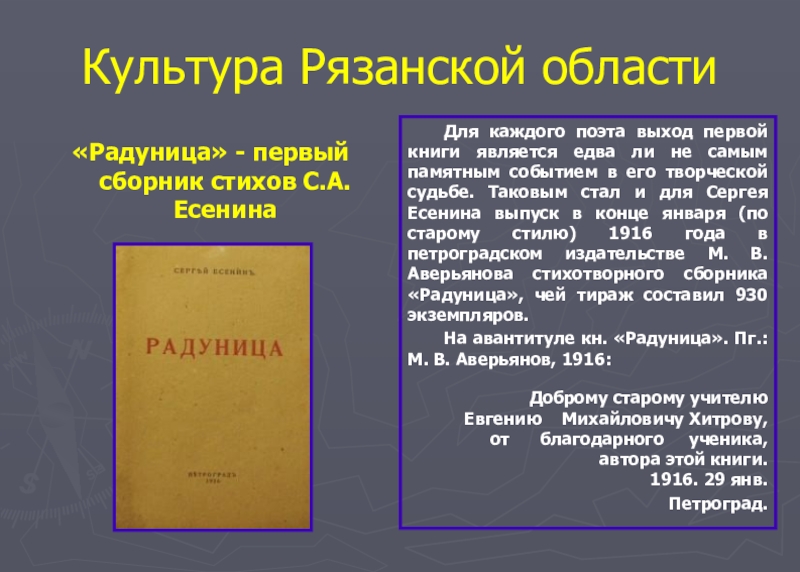 первой книги является едва ли не самым памятным событием в его творческой судьбе. Таковым стал и для Сергея Есенина выпуск в конце января (по старому стилю) 1916 года в петроградском издательстве М. В. Аверьянова стихотворного сборника «Радуница», чей тираж составил 930 экземпляров.