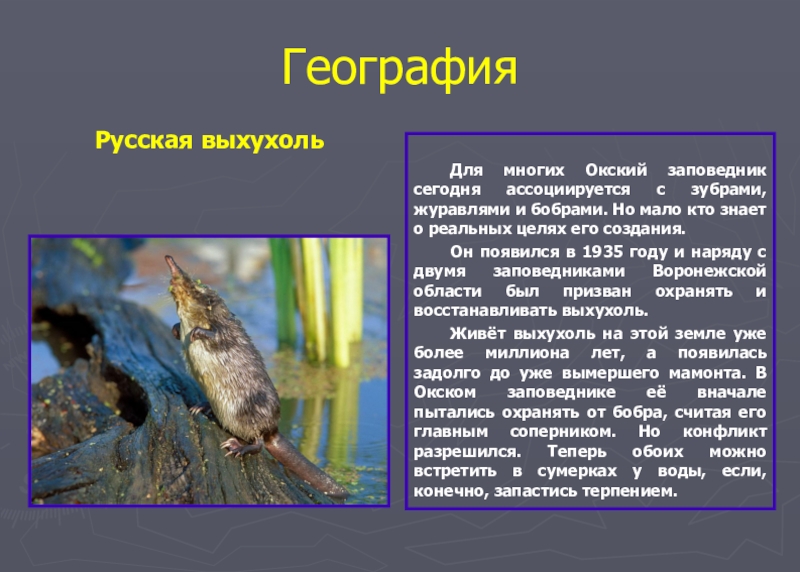 Живёт выхухоль на этой земле уже более миллиона лет, а появилась задолго до уже вымершего мамонта. В Окском заповеднике её вначале пытались охранять от бобра, считая его главным соперником. Но конфликт разрешился. Теперь обоих можно встретить в сумерках у воды, если, конечно, запастись терпением.