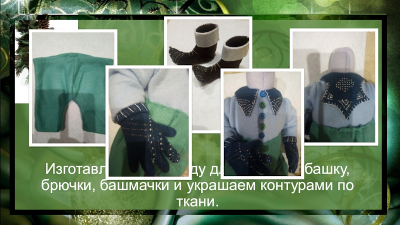 Изготавливаем одежду для гнома: рубашку, брючки, башмачки и украшаем контурами по ткани.