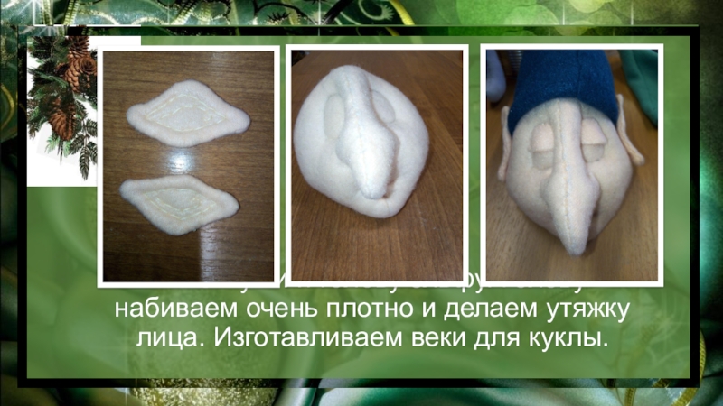 Шьём уши и голову эльфу. Голову набиваем очень плотно и делаем утяжку лица. Изготавливаем веки для куклы.