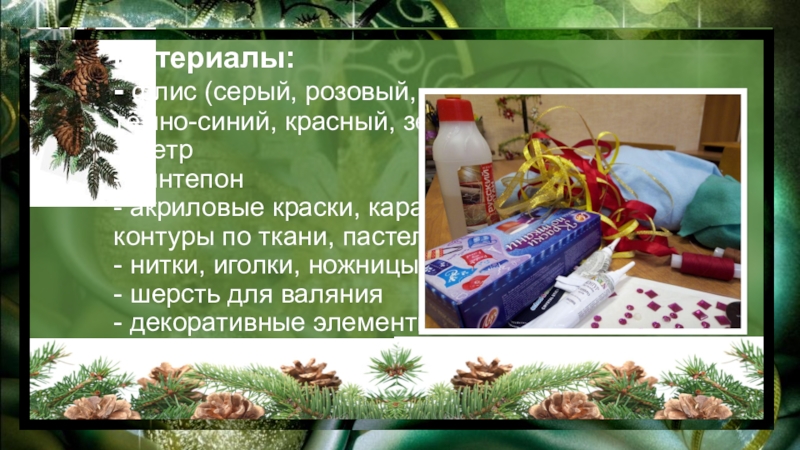 Слайд 2Материалы: - флис (серый, розовый, тёмно-синий, красный, зелёный) - фетр - синтепон - акриловые