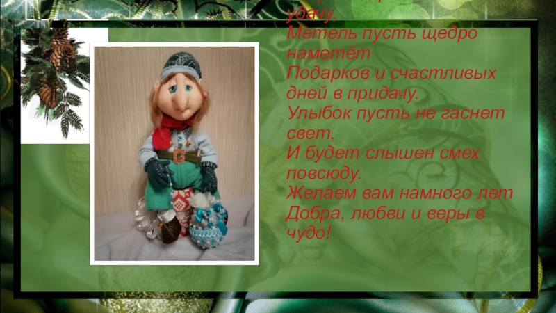 Пусть Новый год вам принесёт Здоровье, радость и удачу, Метель пусть щедро наметёт Подарков и счастливых дней в придачу. Улыбок пусть не гаснет свет, И будет слышен смех повсюду. Желаем вам намного лет Добра, любви и веры в чудо!