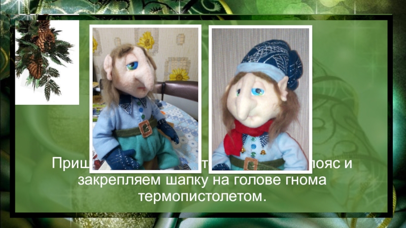 Пришиваем голову к телу. Одеваем пояс и закрепляем шапку на голове гнома термопистолетом.
