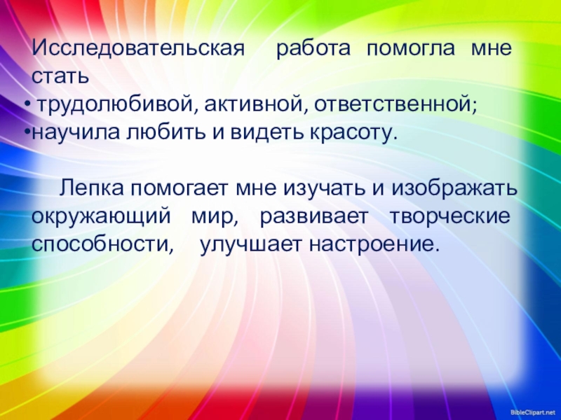 Исследовательская работа помогла мне стать трудолюбивой, активной, ответственной; научила любить и видеть красоту. 	Лепка помогает мне изучать