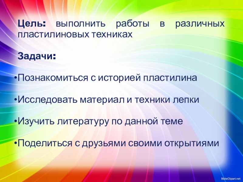 Цель: выполнить работы в различных пластилиновых техникахЗадачи: Познакомиться с историей пластилинаИсследовать материал и техники лепкиИзучить литературу по