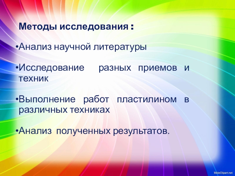 Методы исследования :Анализ научной литературыИсследование разных приемов и техникВыполнение работ пластилином в различных техникахАнализ полученных результатов.