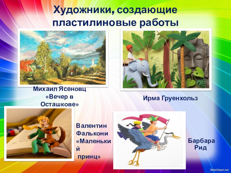 Художники, создающие пластилиновые работы Михаил Ясеновц «Вечер в Осташкове» Ирма Груенхольз  Барбара РидВалентин Фалькони«Маленький принц»
