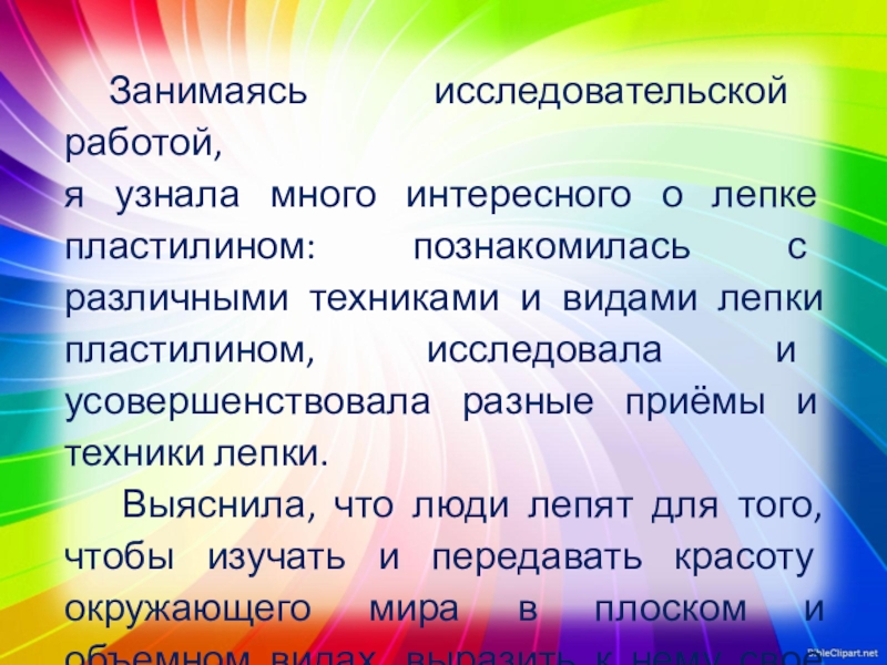 Занимаясь исследовательской работой, я узнала много интересного о лепке пластилином: познакомилась с различными техниками и видами лепки