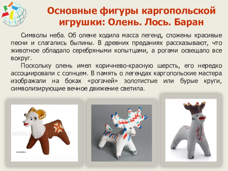 Основные фигуры каргопольской игрушки: Олень. Лось. Баран