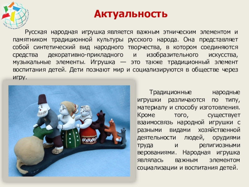 Традиционные народные игрушки различаются по типу, материалу и способу изготовления. Кроме того, существует взаимосвязь народной игрушки с разными видами хозяйственной деятельности людей, орудиями труда и религиозными верованиями. Народная игрушка являлась важным элементом социализации и воспитания детей.