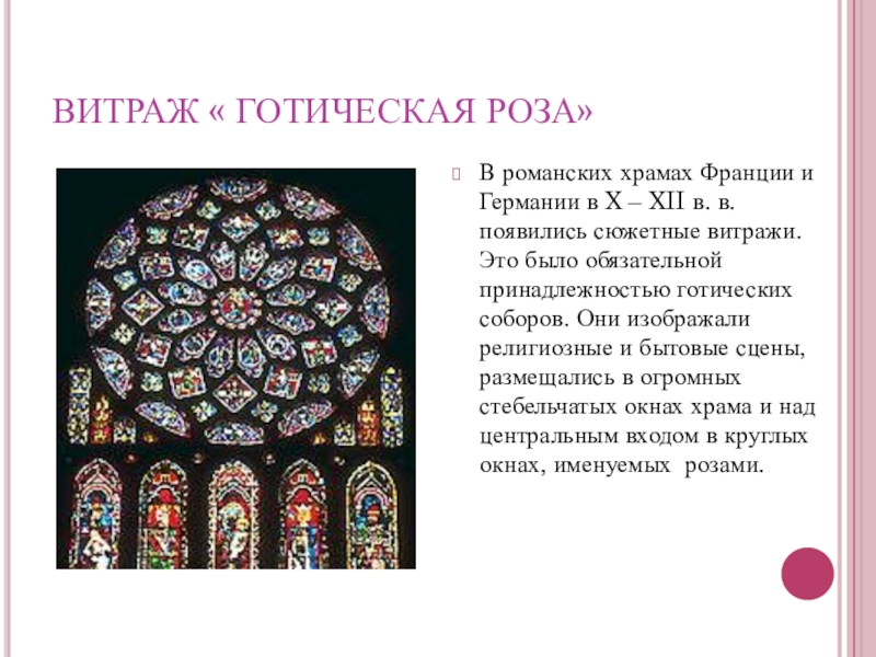 ВИТРАЖ « ГОТИЧЕСКАЯ РОЗА»В романских храмах Франции и Германии в X – XII в. в. появились сюжетные