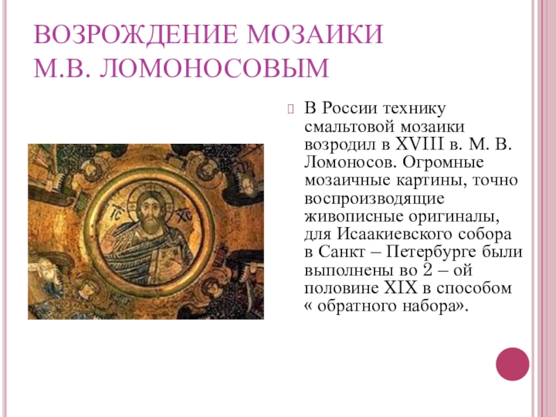 XVIII в. М. В. Ломоносов. Огромные мозаичные картины, точно воспроизводящие живописные оригиналы, для Исаакиевского собора в Санкт – Петербурге были выполнены во 2 – ой половине XIX в способом « обратного набора».