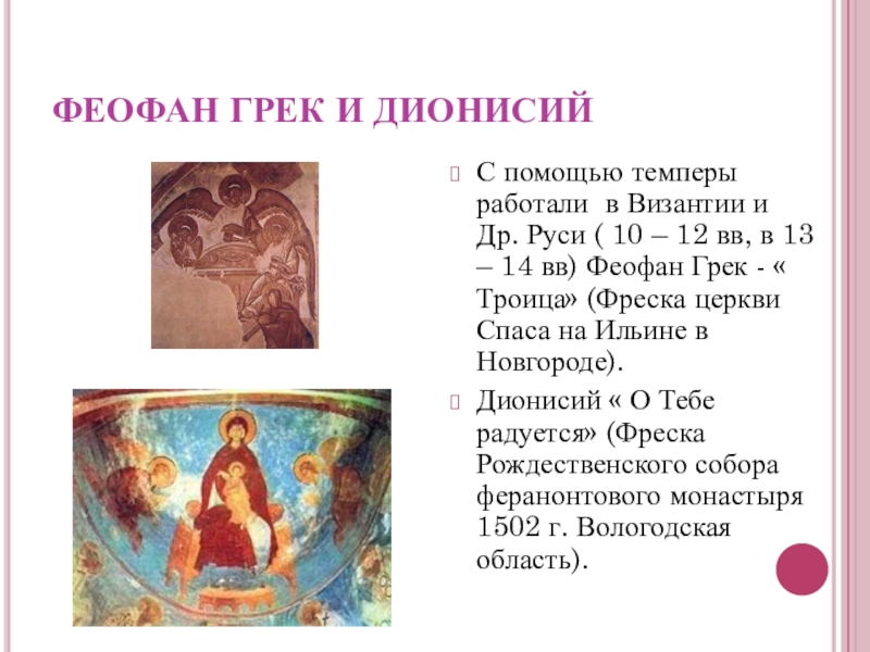 ФЕОФАН ГРЕК И ДИОНИСИЙ С помощью темперы работали в Византии и Др. Руси ( 10 – 12