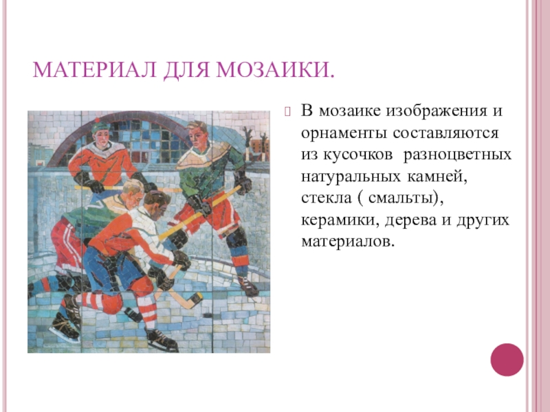 МАТЕРИАЛ ДЛЯ МОЗАИКИ.В мозаике изображения и орнаменты составляются из кусочков разноцветных натуральных камней, стекла ( смальты), керамики,