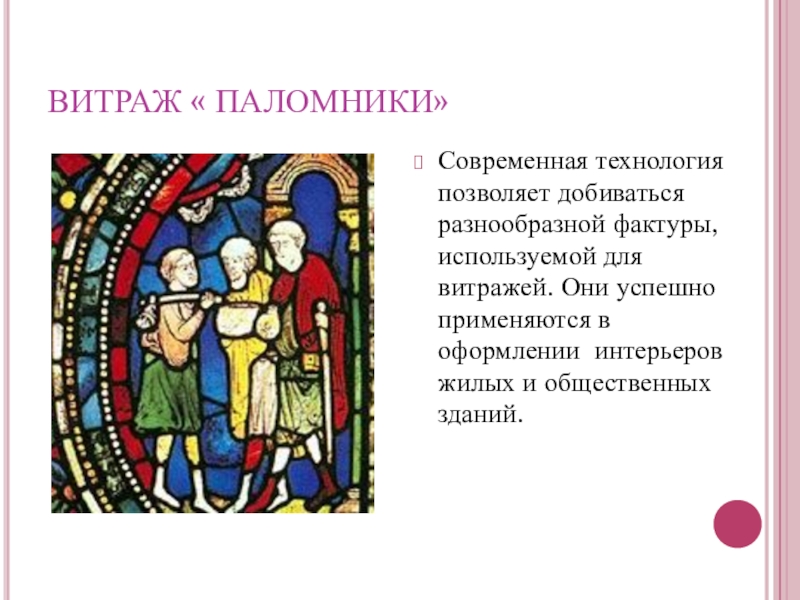 ВИТРАЖ « ПАЛОМНИКИ»Современная технология позволяет добиваться разнообразной фактуры, используемой для витражей. Они успешно применяются в оформлении интерьеров