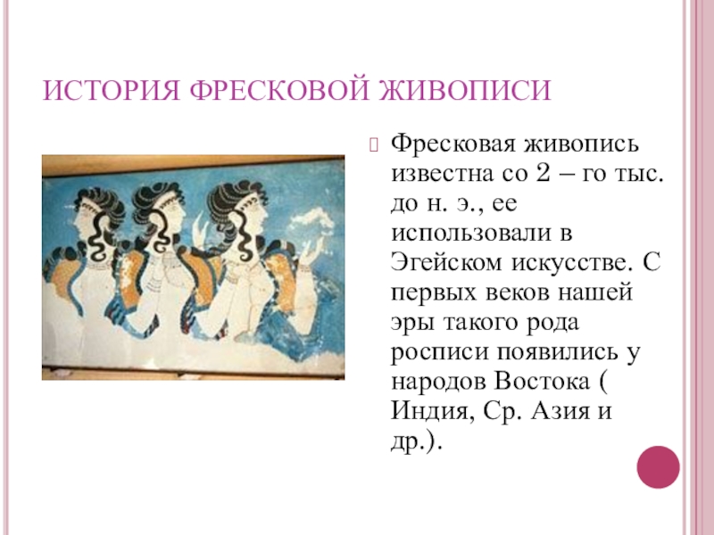 ИСТОРИЯ ФРЕСКОВОЙ ЖИВОПИСИФресковая живопись известна со 2 – го тыс. до н. э., ее использовали в Эгейском